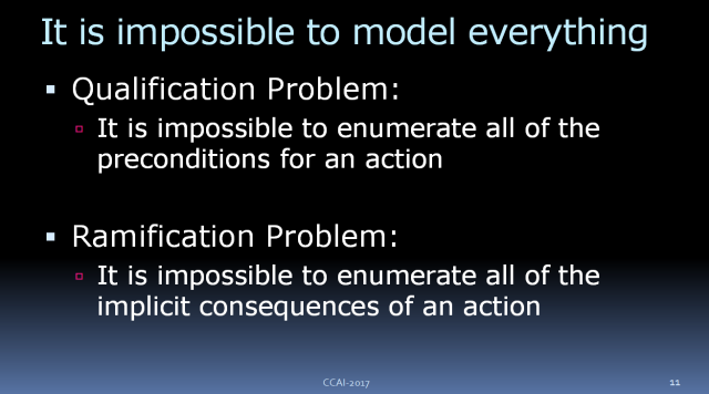 其一是先验条件问题(qualification problems),我们无法把某个行动所有的先决条件全都数字化。比如说一辆车要起步,那么燃料、电池、车钥匙就要考虑在内,但还有其他的条件我们可能就忘记了,此类我们所无法完整考虑的先决条件是无穷无尽的。