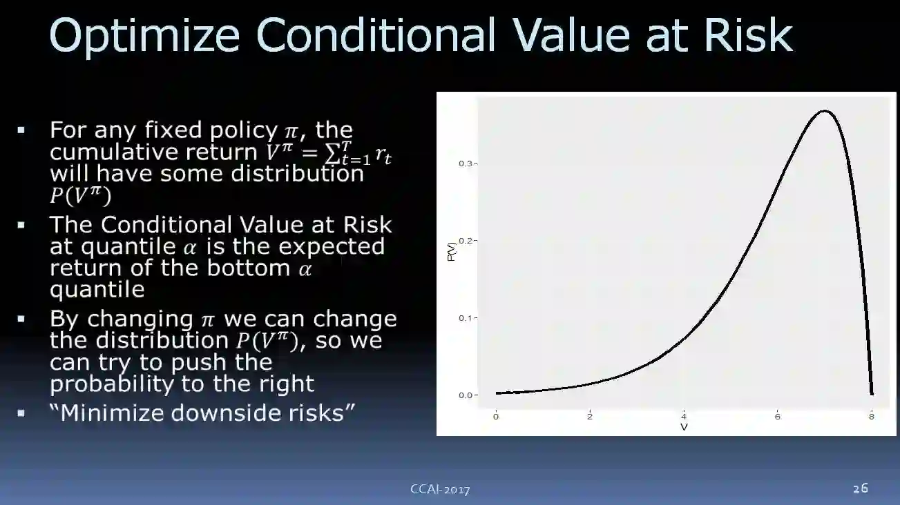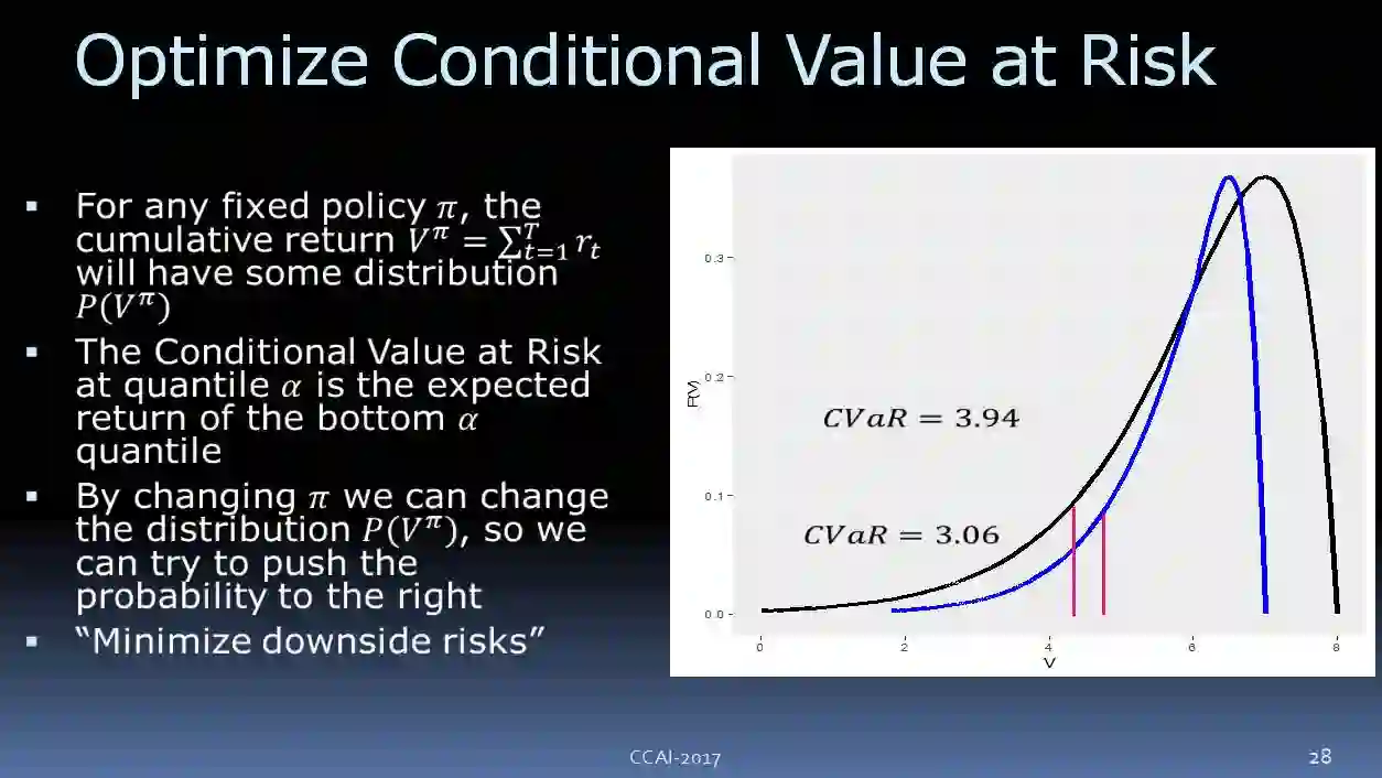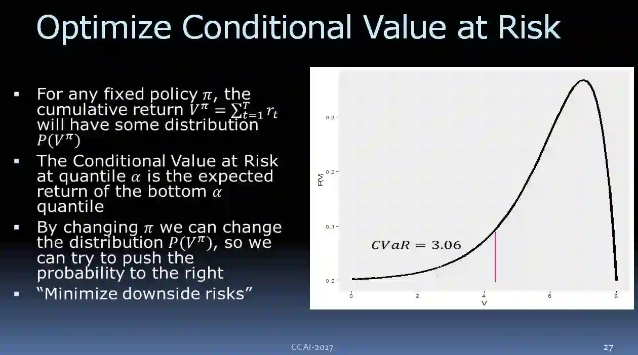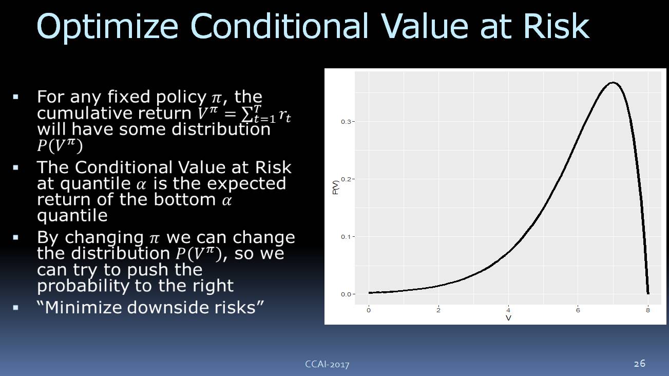 另外,我们还需要一个总回馈参数。我们来看一下,如果策略是固定的,我们要执行它,你可能要调整其他的一些参数,可以想像我们所收到的回馈参数会有这样的概率的分布,可以看到,它有一个下行的风险。我们要优化这个目标,让它尽可能避免下行的风险。我们现在使用的是 CVaR(Conditional Value at Risk) ,如上图所示。