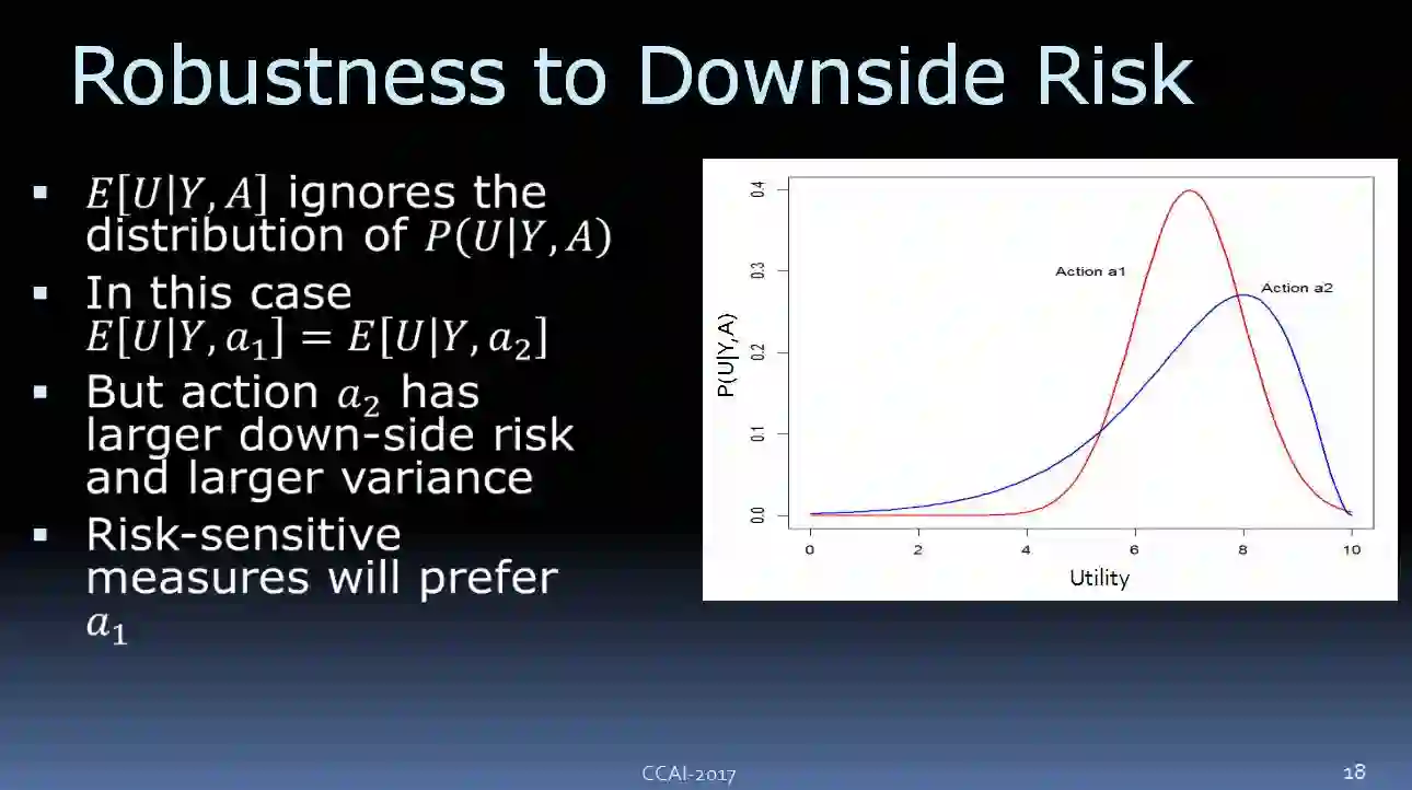 看看上面这个图,我们这边有两种不同的 Action:Action a1 和 Action a2。如果选择 a1,我们会得到如红线所示的结果,如果选择 a2,我们会得到如红线所示的结果。两者期望的效益是一样的,但是 a2 的变化比较大一些,有较高的上行风险和下行风险。