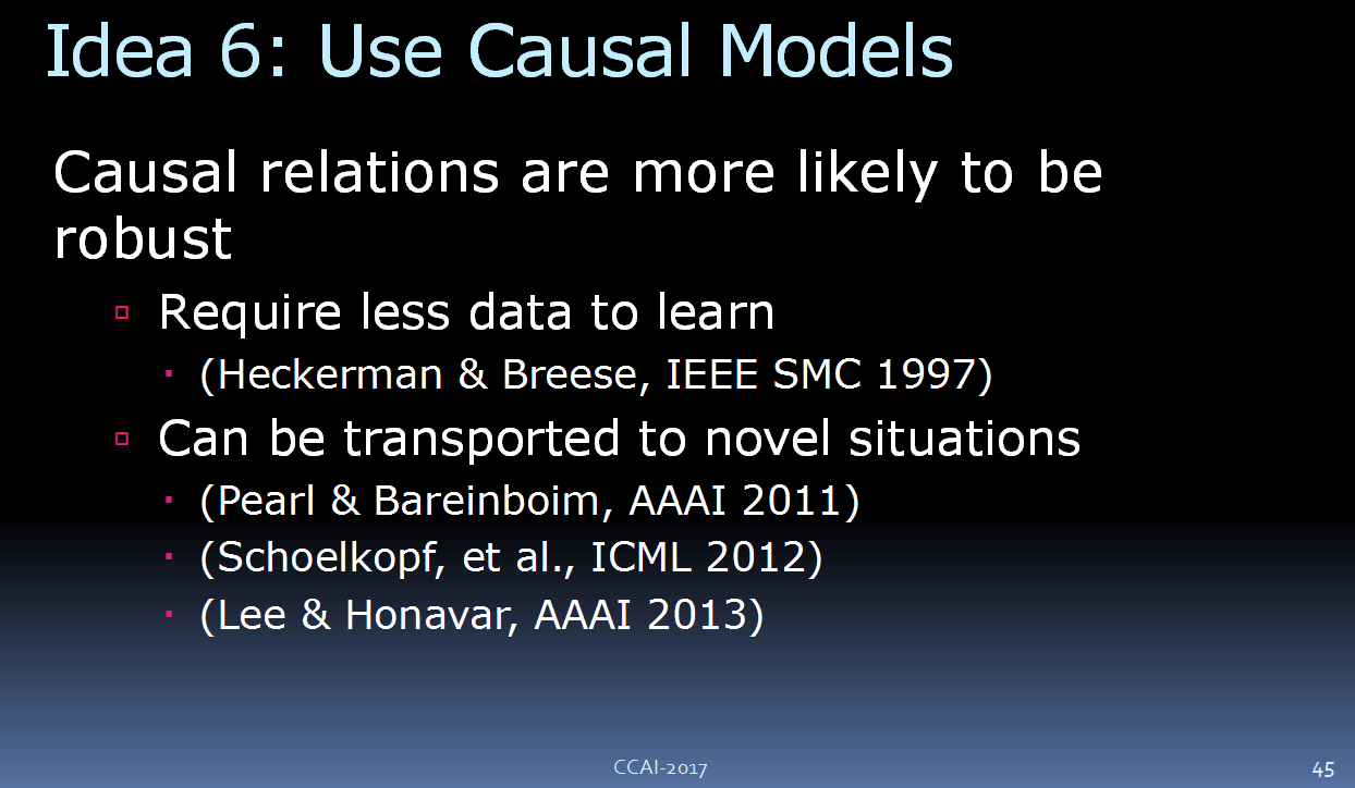 还有一种思路是使用因果模型。 因果模型仅仅需要很少的训练数据,而且它们还以迁移到新的问题领域。