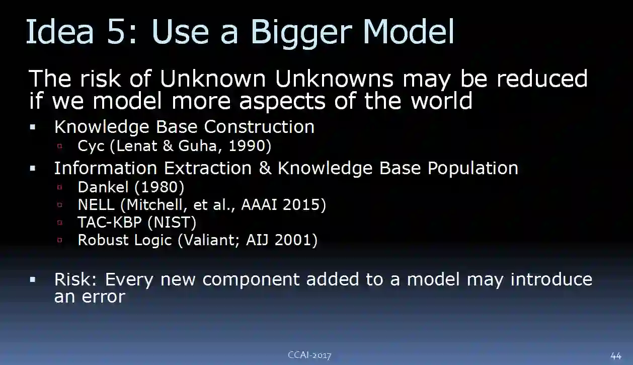 接着,我谈到了“robustness to unmodeled phenomena”,这里针对的是未知的未知。刚刚我提到,我们有一系列的办法可以探测模型是否不完整,以及为什么有时会失效。但是,有的时候,我们能做的只有向人类寻求帮助。可以大胆猜测,大部分的 AI 模型都还太小、太简单。未来,我们需要比现在大得多的知识库,这样我们才能使用更大的模型。