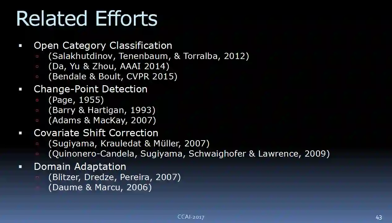 实际上,还有很多其他的尝试,其中一些可能比我们现在的要好。比如Open Category Classification ,Change-Point Detection,Covariate Shift Correction,Domain Adaptation,这些都是和这些问题相关的。