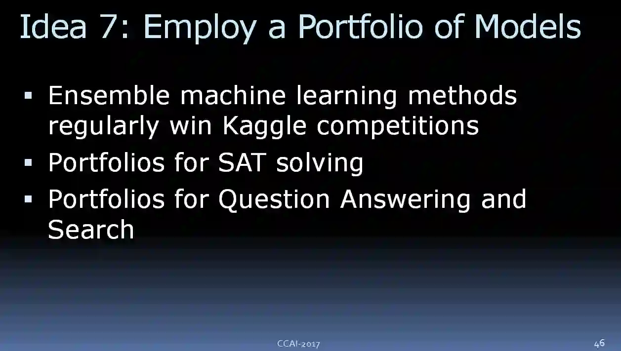 AI 领域里另一个比较重要的思想是“组合(ensemble)”。每一个模型都可能会有不完整或者不正确的地方,但是将这些模型组合起来,我们可以做的更好。在做的各位可能大多都知道 Kaggle 的竞赛,获胜者往往用的是“组合”的方法。