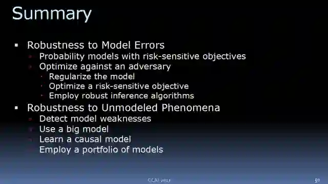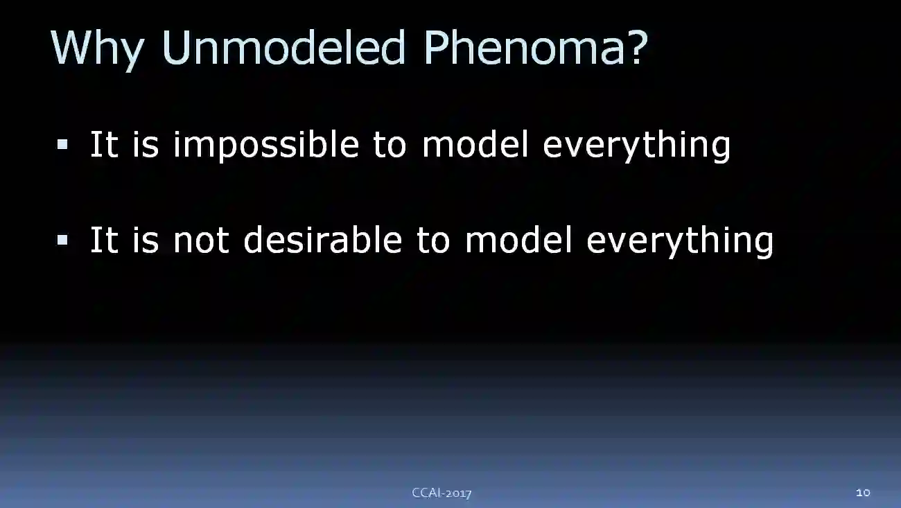这是我的演讲大纲。首先,我会讲“robustness to known unknowns”,我们的模型包含了反应外界重要因素的变量,但是我们对他们是不确定的。接下来,我会讲“robustness to unknown unknowns”,针对没有建模的现象。