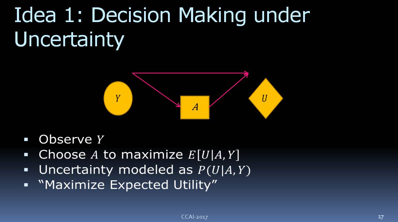 我们可以将该不确定性模型定义为 P[U| A, Y],这是你通常会看到的东西。在任意一本有关人工智能的书或者经济学的书里,都可以看到。