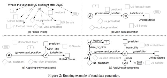 1. Focuslinking(焦点链接)包含实体链接(S-MART工具实现),类型链接(抽取文本的1,2,3元文法,通过词嵌入相似性得到排名top 10的类型结果),时间链接(使用日期格式匹配得到),排序链接(构建最高级词表/序数+最高级模板)等四种;
