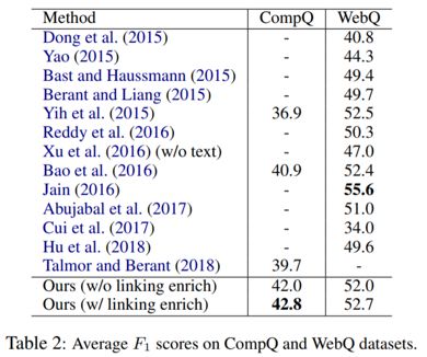 对于作者提出的End2End模型,在CompQ与WebQ数据集上的结果如下,评价指标为答案的平均F1值。可以看到,对于复杂问题的解答性能上,该模型相对其他方法有显著提升,在简单问答任务上,也展现出较为优秀的性能。