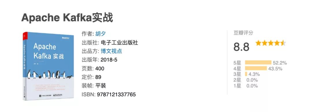 我著有《Apache Kafka 实战》一书,这本书在豆瓣评分 8.8 分。我收到许多读者的留言,说内容实战,看完上手即用,在工作中帮他们解决了问题。