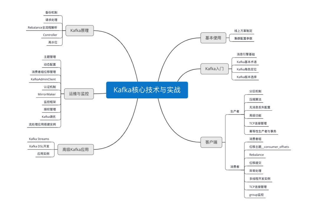 在过去 5 年中,我经历了 Kafka 从最初的 0.8 版本逐步演进到 2.3 版本的完整过程,踩了很多坑也交了很多学费,根据我的实战经验,我把 Kafka 学习框架整理成了下图。具体地,分为 Kafka 入门、Kafka 的基本使用、客户端详解、Kafka 原理介绍、Kafka 运维与监控以及高级 Kafka 应用。