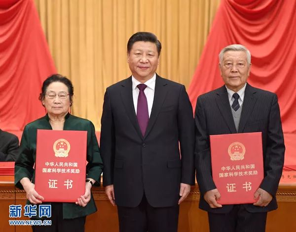 习近平总书记向获得2016年度国家最高科学技术奖的赵忠贤院士(右)和屠呦呦研究员(左)颁奖