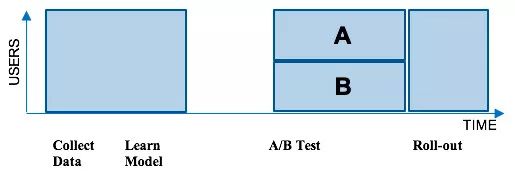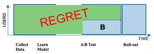 Netflix的推荐引擎有很大一部分是由机器学习算法驱动的。传统上,我们会收集一批关于我们的用户如何使用这项服务的数据。然后我们在这批数据上运行一种新的机器学习算法。接下来,我们将通过一个A/B测试来测试这一新的算法,以对抗当前的系统。A/B测试可以帮助我们在随机分组的成员中进行尝试,了解新算法是否优于当前的系统。A组的成员使用当前的系统,而B组的成员则得到新的算法。如果发现B组的成员与Netflix有更高的互动,那么我们就会向全体成员推出新的算法。不幸的是,这批处理方法会带来遗憾(regret):许多成员长时间没有从更好的体验中受益。如下图所示。
