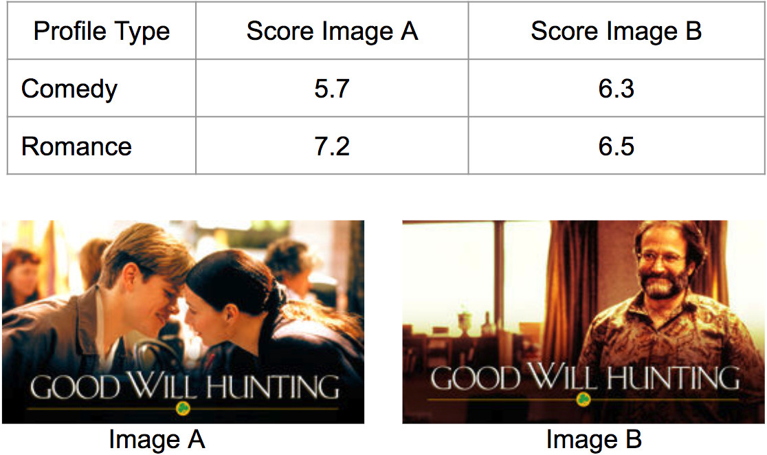 让我们考虑一下,尝试怎么将电影《心灵捕手》的封面图变得个性化。在这里,我们可以根据一个成员喜欢不同类型和主题的程度来将这个决定个性化。对于看过很多浪漫电影的人来说,如果我们展示的是包含Matt Damon和Minnie Driver的封面图,可能会引发他们对《心灵捕手》的兴趣。而如果我们使用的是包含著名喜剧演员Robin Williams的封面图,那么看过很多喜剧的人可能会被吸引到这部电影里去。