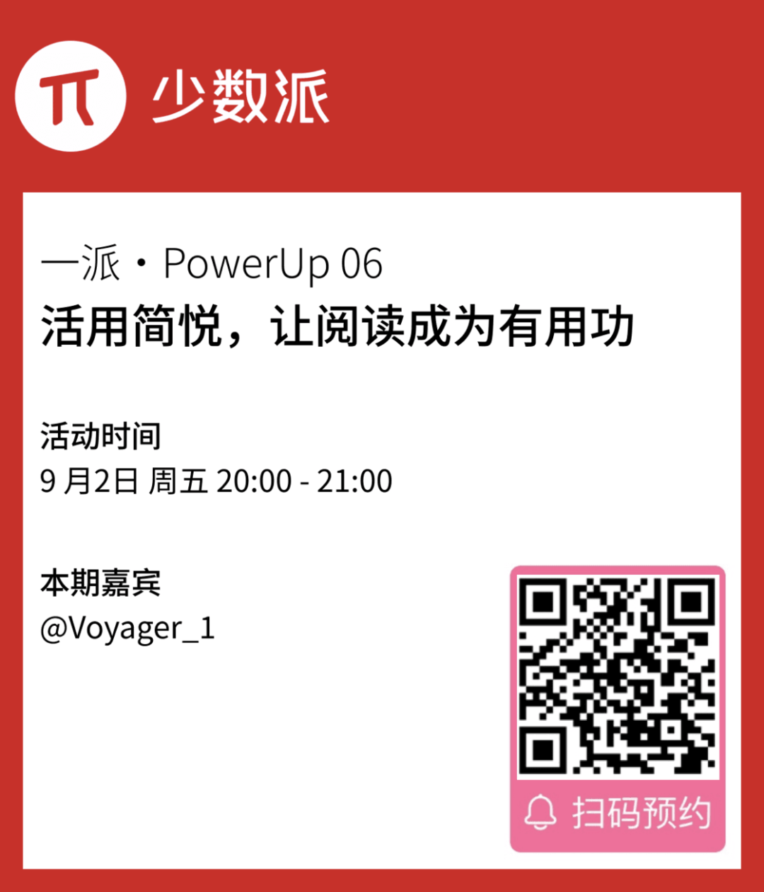 如果你对简悦和知识管理的话题感兴趣,欢迎参加 今晚 20 点举办的「一派·PowerUp」直播活动,和我们一起来学习如何活用简悦,让阅读成为有用功: