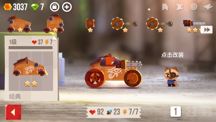其实 ZeptoLab 也类似,《割绳子》火了之后他们推出了多款续作,虽然下载量不错,但都算是重复。让我最惊艳的一款游戏是他们的最新作品《喵星大作战》,在游戏中你会驾驶自己改装的战车与另一个玩家战斗,游戏是 1V1 的形式,但是并不需要你手动操作,你要做的是在对战前组装好战车。每个战车都由多个部件组成,有生命、攻击、电力(决定战车的承载力)三个属性,部件的星级越高则越强,随着等级提升部件会由简单的木质变为更高级的材料。不同的组合方式会改装成你的专属战车,部件通过开宝箱获得,类似《皇室战争》。对机械感兴趣的玩家应该会喜欢这款游戏。
