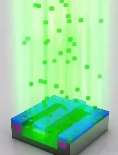 离子注入完成后,光刻胶也被清除,而注入区域(绿色部分)也已掺杂,注入了不同的原子。注意这时候的绿色和之前已经有所不同。