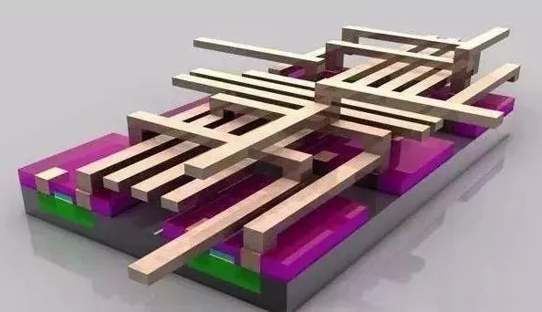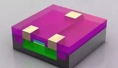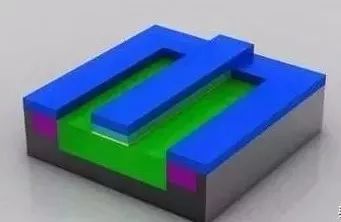 至此,晶体管已经基本完成。在绝缘材(品红色)上蚀刻出三个孔洞,并填充铜,以便和其它晶体管互连。