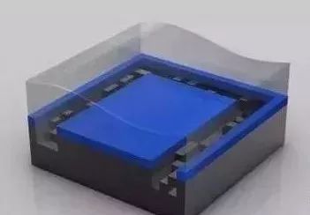 图中蓝色部分就是在晶圆旋转过程中浇上去的光刻胶液体,类似制作传统胶片的那种。晶圆旋转可以让光刻胶铺的非常薄、非常平。