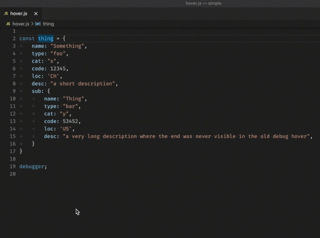 为了最大程度减少滚动需求,悬停调试窗口的宽度和高度现在会自动适应内容的大小。这不仅可以帮助获得完整的字符串,还可以深入到对象结构中。