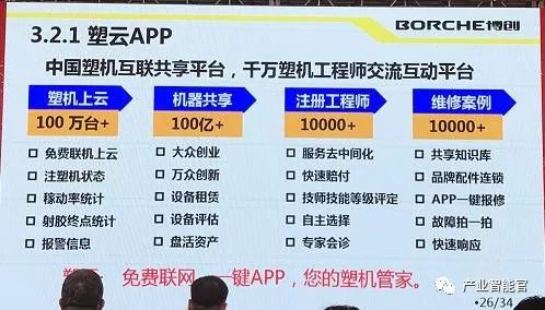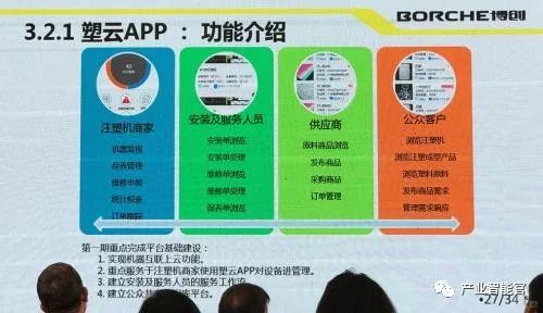 在设备大数据平台的基础上,博创构建了注塑行业的工业互联网平台——塑云平台。通过塑云平台,可以将有订单的企业和有设备的企业联系起来,共享设备资源,并在此基础上实现更多的增值服务,如工厂产品质量把控,机器维修费用、保养费用、维修时间的预测等。这些服务整合到塑云APP,并通过塑云APP连接行业更多人士,整合行业信息,实现更高效资源配置。
