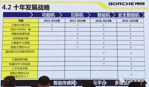 到2022年,博创的计划是建造注塑工艺专家系统(人工智能),让机器建立知识自动化推理框架。使注塑成型过程知识自动化,对为了故障实现预测和自我诊断、自我维修。博创的中国制造2025计划将继续围绕注塑机,专注注塑行业。期望把现阶段的互联注塑机,做成智能机,实现机器自学习自适应,利用深度学习实现安全、智能生产制造。