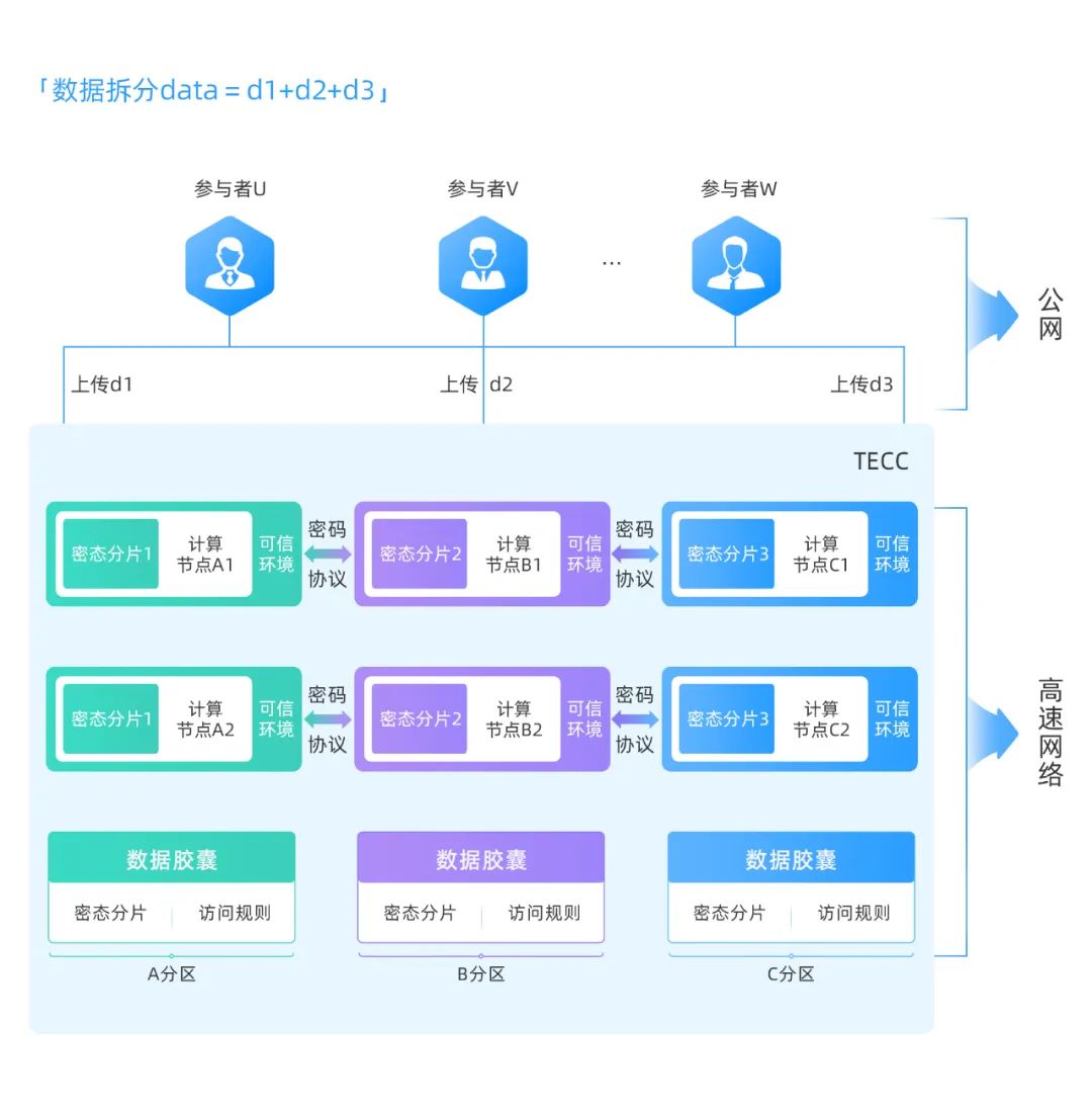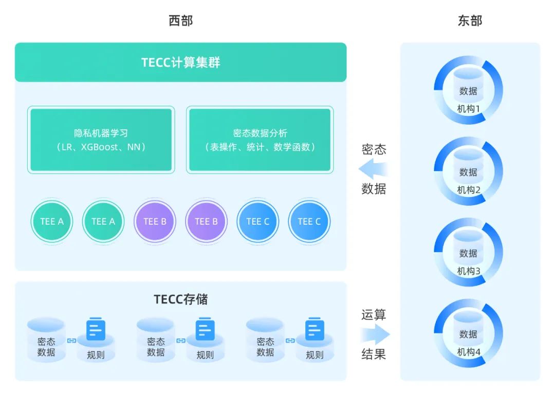 TECC支持任意多的参与方、支持复杂的运算逻辑的特性,还能在综合性密态数据中心(如东数西算)等得到应用。