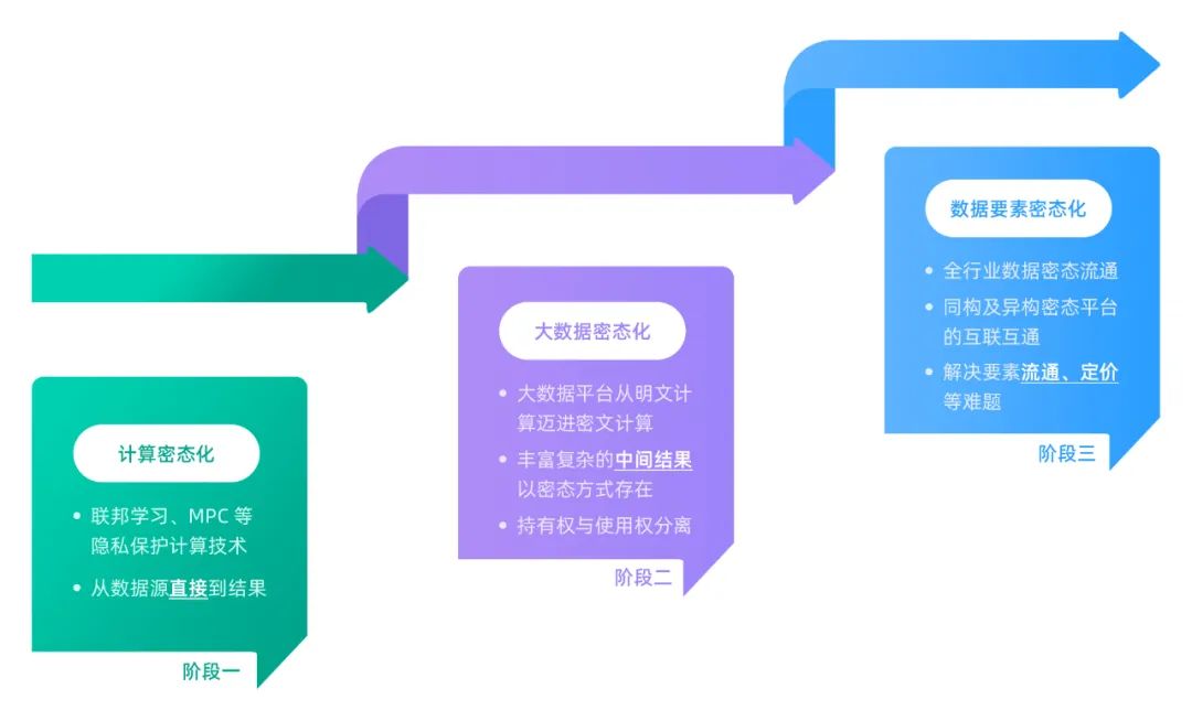 数据密态时代,每个阶段的技术要求和应用侧重不同,需要经历三个发展阶段,依次是:“计算密态化”、“大数据密态化”、“数据要素密态化”。