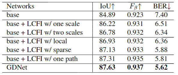 表2.“base”表示网络已删除所有LCFI模块。“one scale”和“two scale”表示LCFI模块中有一个LCFI模块和两个LCFI模块。“local”表示将LCFI中的空间可分离卷积替换为局部卷积,并保持参数大致相同。“sparse”采用空洞卷积来实现与空间可分离卷积相似的感受野。“一个路径”表示在每个LCFI块中只有一个空间可分离的卷积路径。LCFI模块包含四个LCFI模块,每个模块包含两个并行路径。