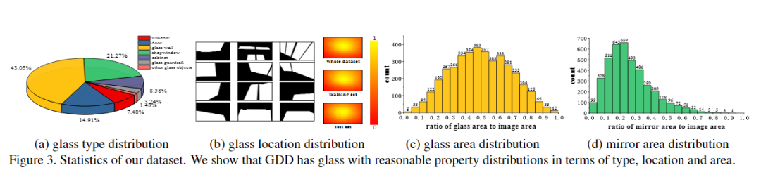 •玻璃位置。我们的GDD中玻璃位于图像的不同位置,如图3(b)所示。我们进一步计算了概率图,该概率图表明每个像素在玻璃区域中的分布可能性显示了GDD中玻璃的位置分布。总体空间分布倾向于居中,因为玻璃通常较大且覆盖中心。此外,训练/测试分割的玻璃空间分布与整个数据集的玻璃空间分布一致。