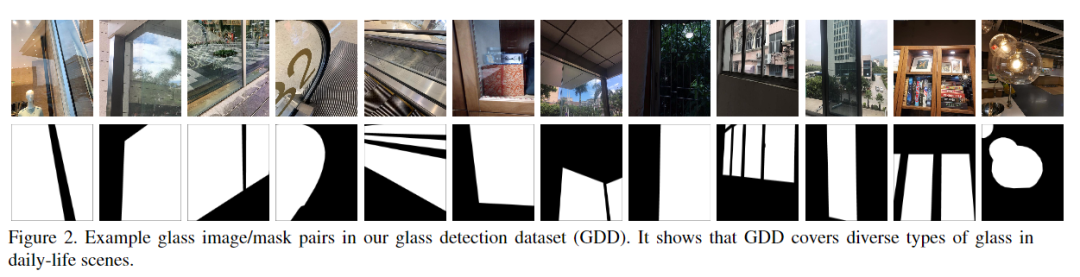 使用一些最新的相机和智能手机捕获玻璃图像,并用专业的标注工具标记像素级玻璃mask。所构建的玻璃检测数据集GDD涵盖了各种日常生活场景(例如,浴室,办公室,街道和购物中心) ,其中从室内场景拍摄了2827张图像,而从室外场景拍摄了1089张图像。图2显示了GDD中的一些示例玻璃和玻璃mask图像。对于数据集拆分,随机选择2,980张图像进行训练,其余936张图像用于测试。