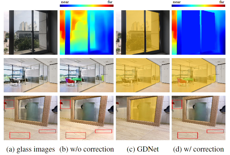 图1.现有视觉任务中的玻璃问题。在深度预测中,现有方法错误地预测了场景在玻璃后面的深度,而不是到玻璃的深度((b)的第1步)。例如,分割方法Mask RCNN 仅分割的实例在玻璃后面,而实际上算法并不知道他们在玻璃后面((b)的第二行)。此外,如果我们将现有的单幅图像反射消除(SIRR)方法直接应用于仅部分被玻璃覆盖的图像,则非玻璃区域可能会损坏((b)的第3行)。GDNet可以检测到玻璃(c),然后纠正这些故障情况(d)。