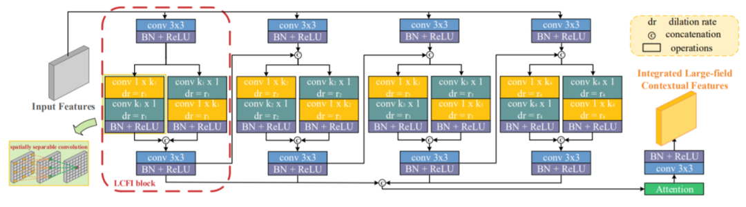 为了解决这个问题,基于LCFI块提出了一个LCFI模块来从不同规模的大领域中获取上下文特征。具体来说,将输入特征输入到四个并行LCFI块中,并使用注意力模块融合其输出。为了进一步探索更多的上下文功能,在相邻LCFI块之间添加了信息流,即,将当前LCFI块的输出馈送到下一个LCFI块。实际上,对于四个LCFI块中的空间上可分离的卷积,卷积核核大小分别设置为3、5、7、9,空洞率分别设置为1、2、3、4。