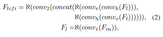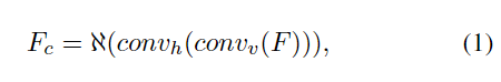 其中,F表示输入特征,convv和convh分别表示卷积核大小为k×1的垂直卷积和卷积核大小为1×k的水平卷积。א表示批处理归一化化(BN)和ReLU运算。Fc表示提取的大视野上下文特征。