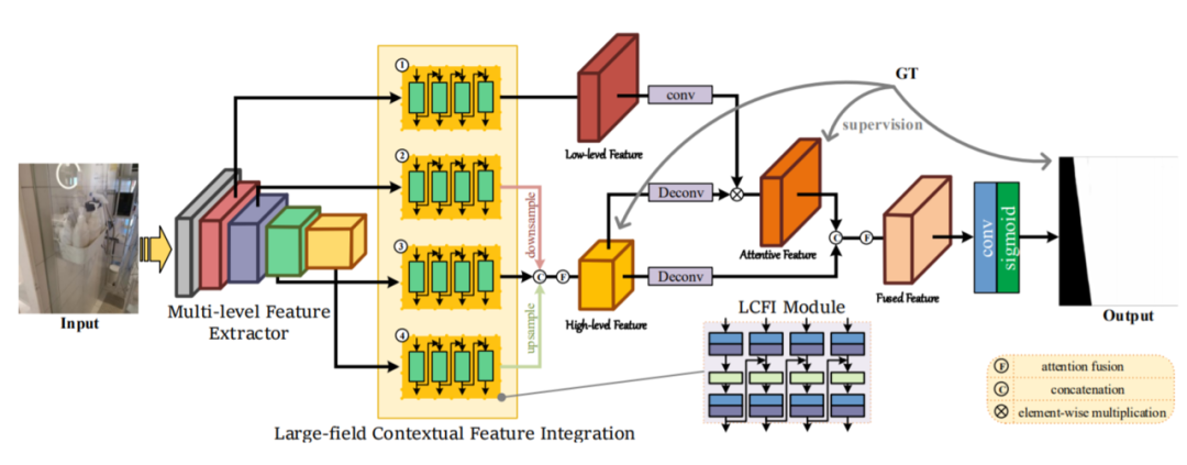 图4给出了玻璃检测网络(GDNet)的结构。它使用LCFI模块(图5)来学习大范围上下文特征。给定单个RGB图像,首先将其输入到多级特征提取器(MFE)中以收获不同级别的特征,然后将其进一步馈送到四个LCFI模块中以学习大感受野上下文特征。最后三个LCFI模块的输出融合在一起,以生成高级别的大视野上下文特征,这些特征将用于指导第一个LCFI模块提取的低级别的上下文特征,从而将更多的注意力集中在玻璃区域上。最后,融合了高级别大感受野上下文特征和细粒度的低级上下文特征,以产生最终的玻璃检测结果。