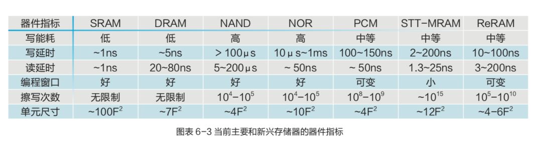 由于能够连接逻辑和存储器电路,并且与逻辑器件完全兼容,SRAM 是不可或缺的片上存储器,其性能和密度不断受益于 CMOS 的尺寸缩放。其易失性使得芯片上或芯片外的非易失性存储器成为必须。当前主要和新兴存储器的器件指标如下: