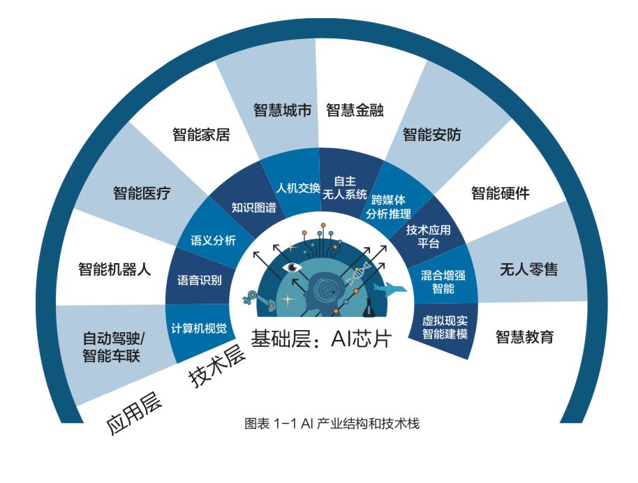 AI 技术的落地需要来自多个层面的支持,贯穿了应用、算法机理、芯片、工具链、器件、工艺和材料等技术层级。各个层级环环紧扣形成AI的技术链,而AI芯片本身处于整个链条的中部,向上为应用和算法提供高效支持,向下对器件和电路、工艺和材料提出需求。