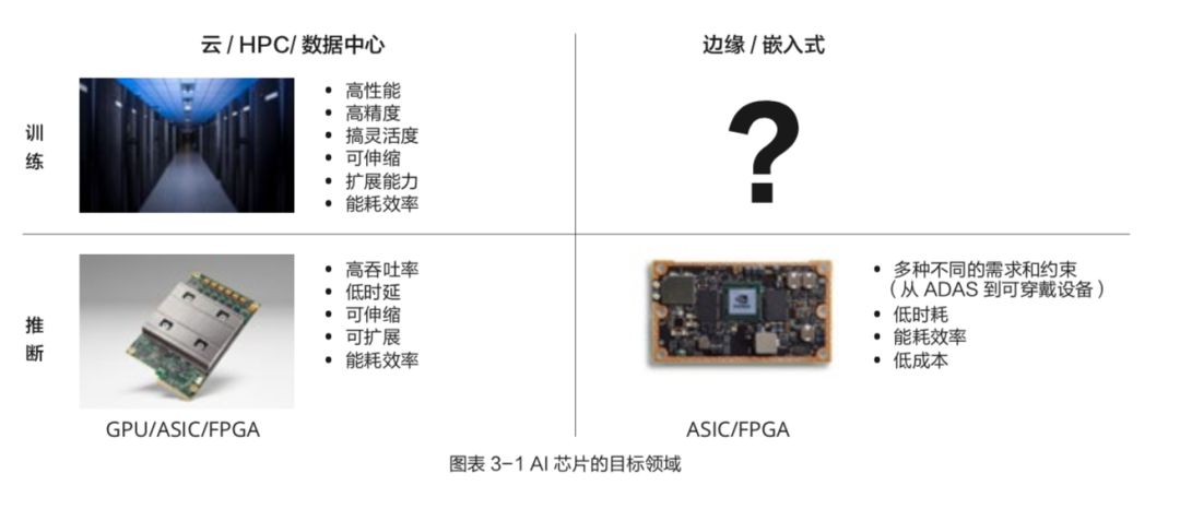 针对应用目标是「训练」还是「推断」,把 AI 芯片的目标领域分成 4 个象限。