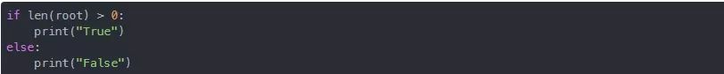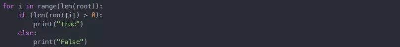 上面的代码将输出“True”,因为根节点确实有子节点。但是,如果我们对根节点的子节点进行相同的检查,就像下面的代码中所示,输出将是“False”。
