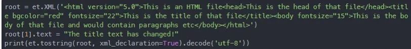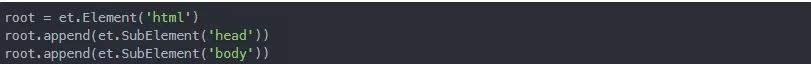 使用etree模块,我们可以创建XML/HTML元素及其子元素,这在我们试图写入或操作HTML或XML文件时非常有用。我们来尝试使用etree创建一个HTML文件的基本结构: