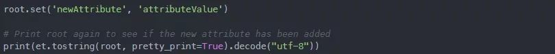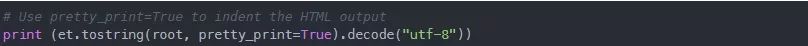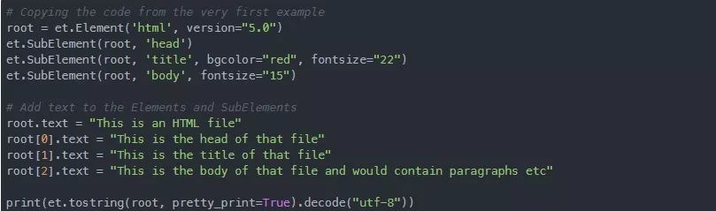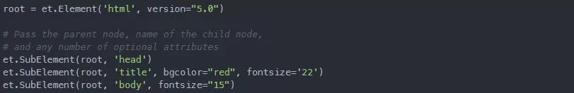 在上面的代码中,您需要知道Element函数至少需要一个参数,而SubElement函数至少需要两个参数。这是因为Element函数只“需要”将要创建的元素的名称,而SubElement函数不仅需要根节点的名称,还需要将要创建的子节点的名称。
