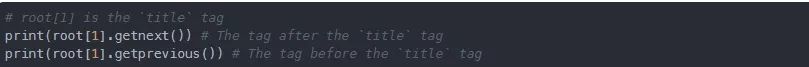 在这里,您可以看到root[1].getnext()检索到了“body”标记,因为它是下一个元素,而root[1].getprevious()检索了“head”标记。