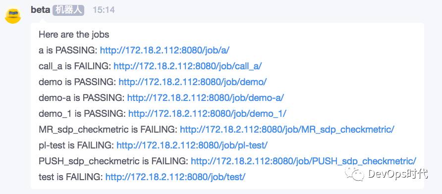 hubot Jenkins ,跟它说把所有的job列表打出来,它就说这些是列表。