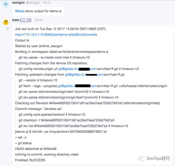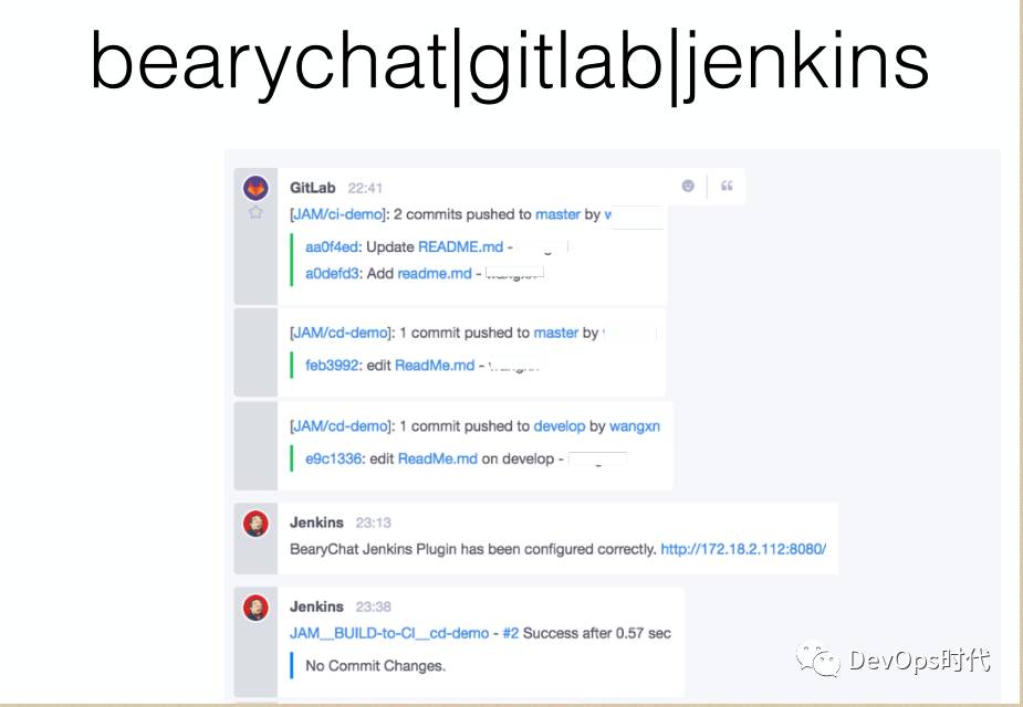 效果是:不用打开网页点点点;在聊天室,所有触发的动作其他人可以看到; 还有一个比较方便的点,手机端装一个 bearychat 客户端,比如你正在坐班车或者正在下班路上,手机可以触发一些事,也可以查某个机器的状态。 hubot 和其他工具也可以做集成,如 Jira 、 GitLab ,提供更加快捷的方式。