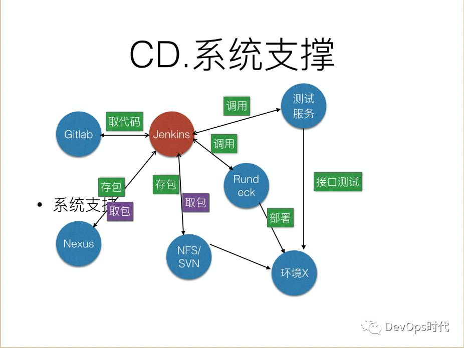 系统调用,代码管理使用 GitLab ,中间是 Jenkins,通过 Jenkins 打包,部署工具使用 Rundeck ,当部署完成时自动调测试。