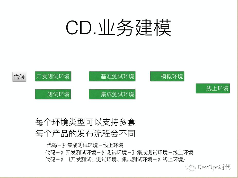 从代码到开发测试环境和测试环境、基准测试环境、集成测试环境、模拟环境和线上环境,每个环境可以支持多套,环境部署成功后会自动调用集成测试。