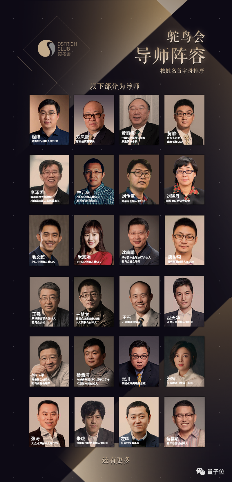 在王强、沈南鹏、徐小平三位驻会导师的带领下,鸵鸟会导师团由红杉资本中国基金与真格基金旗下众多独角兽企业创始人及核心高管,各行业知名专家,人文艺术领域影响力人物组成。