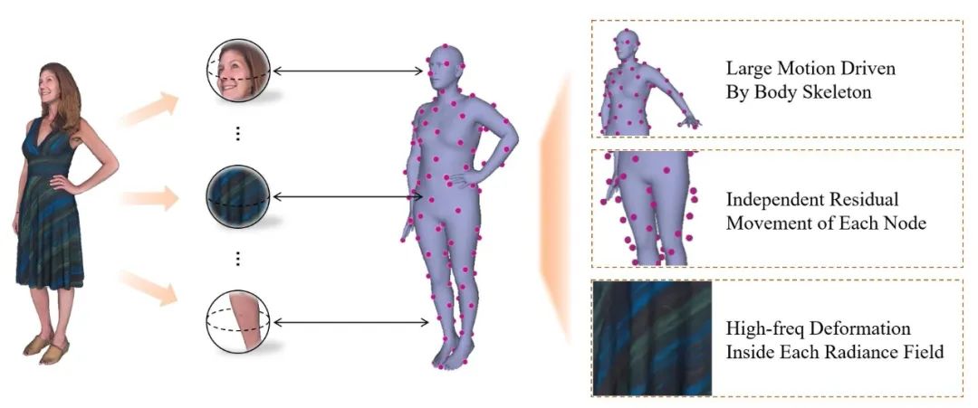 在三维人体重建领域中,OPPO 研究院通过改进 NeRF 创新的动态角色建模方法,在业界首次实现了自动为宽松着装人体创建数字分身的工作。该建模方法仅通过分析摄像头所拍摄的 RGB 视频,就可以 1:1 精准还原人物动态细节,甚至包括衣服细小 logo 或纹理细节。