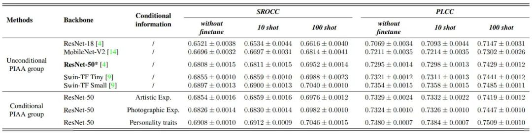 相比通用美学评价模型(GIAA),本文中的个性化美学评价算法使用个人数据进行了微调,旨在学习个性化审美偏好。相比无条件的 PIAA 模型,条件 PIAA 建模时分别添加了三种条件信息,包括个体性格、美学经验和摄影经验。