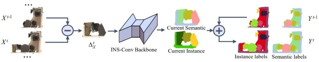 INS-Conv 的语义分割管道。核心是 INS-Conv 骨干网络,用于对一系列逐渐变化的输入几何的残差进行增量特征提取。之后,聚类阶段和融合阶段生成时间一致的语义和实例分割结果。