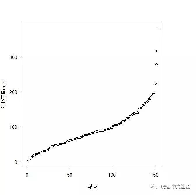 plot(sort(Data$rain), ylab=" 年降雨量(mm)", las=1, xlab='站点')