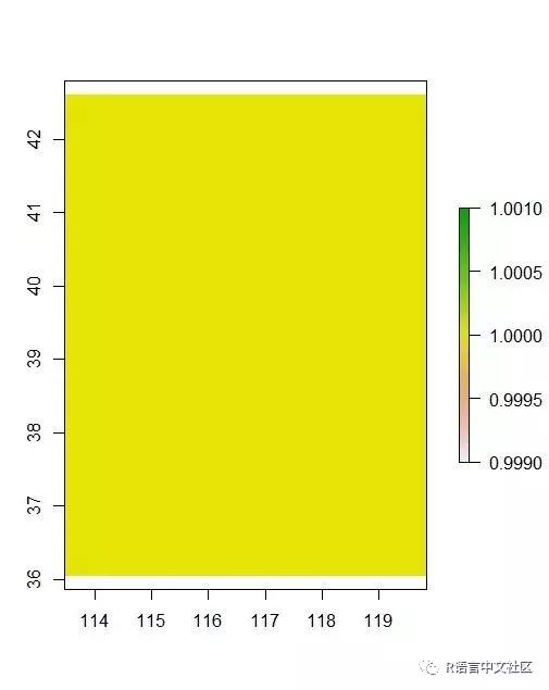 因为给栅格的赋值都为1,因此上图显示的也只有一个颜色,你也可以给栅格赋值多个,即nrow*ncol